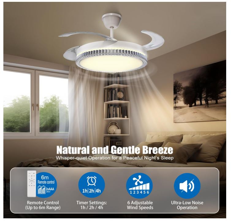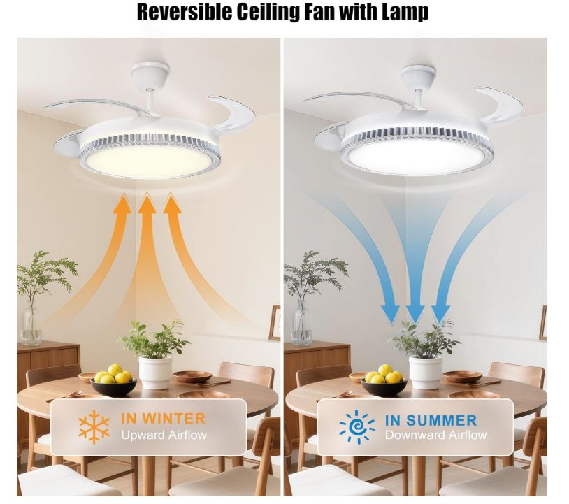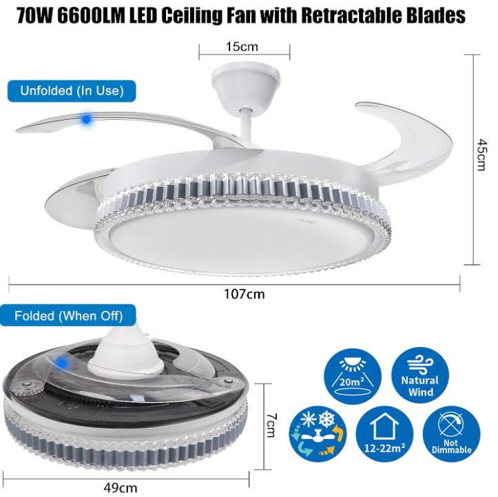 | Key Features: • Stylish all-in-one fan and lighting fixture • Adjustable CCT LED lighting: 3000K, 4200K, 6500K • 30W energy-saving DC motor for quiet operation • 70W LED panel providing 600 lumens • Remote controlled for lighting modes and fan speeds • Application: Ideal for homes, showrooms, offices, hospitality venues and interior upgrades