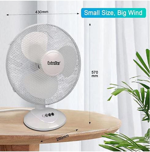 • Power: 50W • Voltage: 220V ~ 50Hz • Fan Size: 16 inch (3-blade) • Speed Settings: 3 levels • Oscillation: 90° horizontal swing • Colour: White |